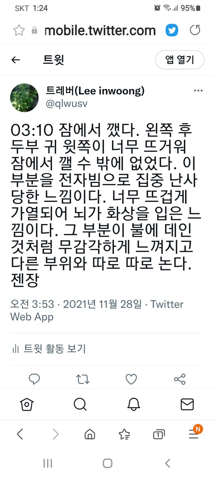 03:10 잠에서 깼다. 왼쪽 후두부 귀 윗쪽이 너무 뜨거워 잠에서 깰 수 밖에 없었다. 이 부분을 전자빔으로 집중 난사 당한 느낌이다. 너무 뜨겁게 가열되어 뇌가 화상을 입은 느낌이다. 그 부분이 불에 데인 것처럼 무감각하게 느껴지고 다른 부위와 따로 따로 논다. 젠장
