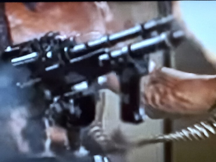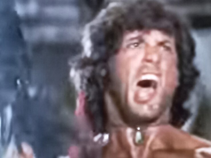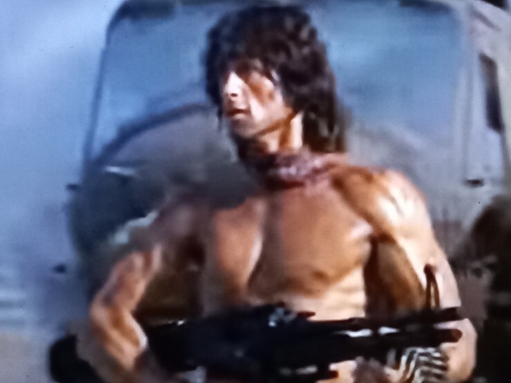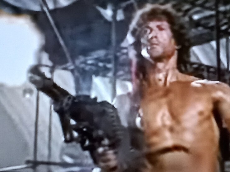 람보2 - 마지막 장면, 자기를 버린 작전본부 사무실 장비들을 M60 기관총으로 날려버린다.