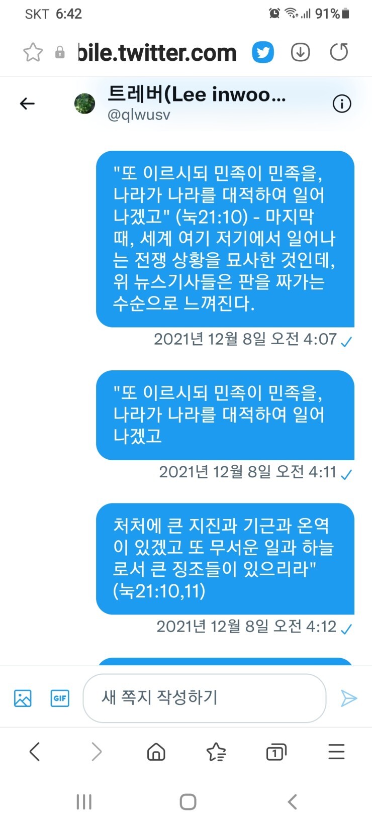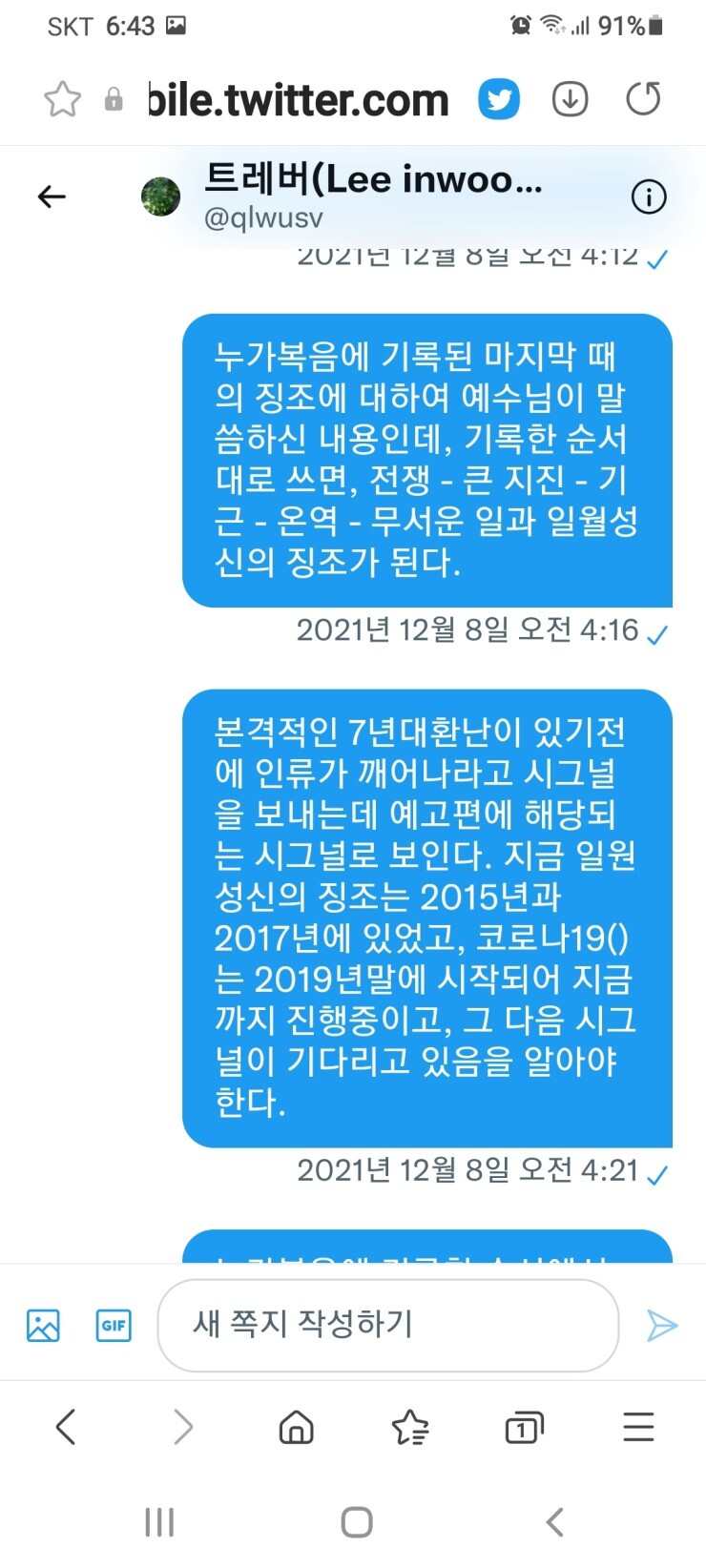트위터 내 쪽지함 캡처